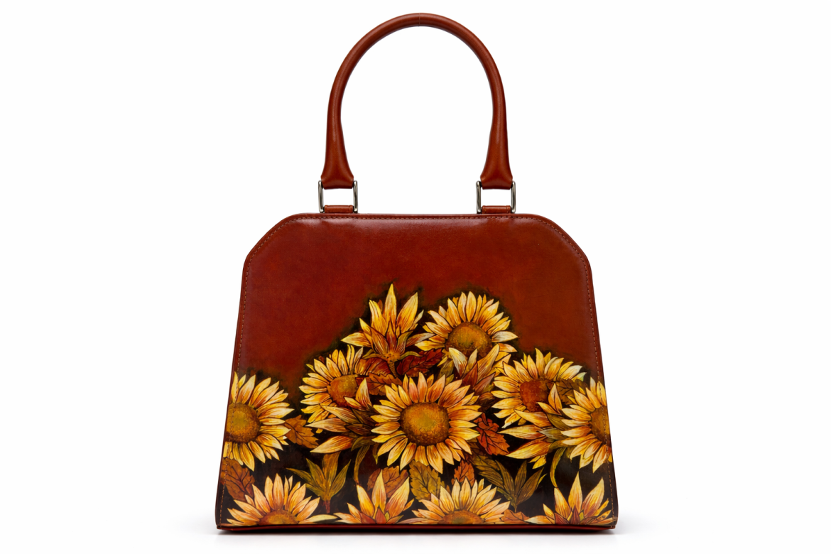 Dámská ručně malovaná malá kabelka: ART - Slunečnice (hlazenice - malba/tříslo - koňaková), zhotovená z hovězí usně (pravá kůže), uzavíratelná zipem. Kabelka je opatřena dvěma kulatými držadly do ruky a jedním plochým nastavitelným řemenem na rameno, který lze nosit i crossbody.