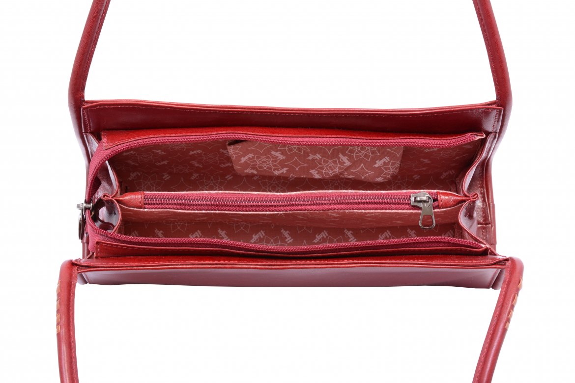Dámská malá kabelka: CLASSIC (tříslo - tmavě červená), zhotovena z hovězí usně (pravá kůže), uzavíratelná zipem. Kabelka je opatřena dvěma kulatými držadly na rameno.