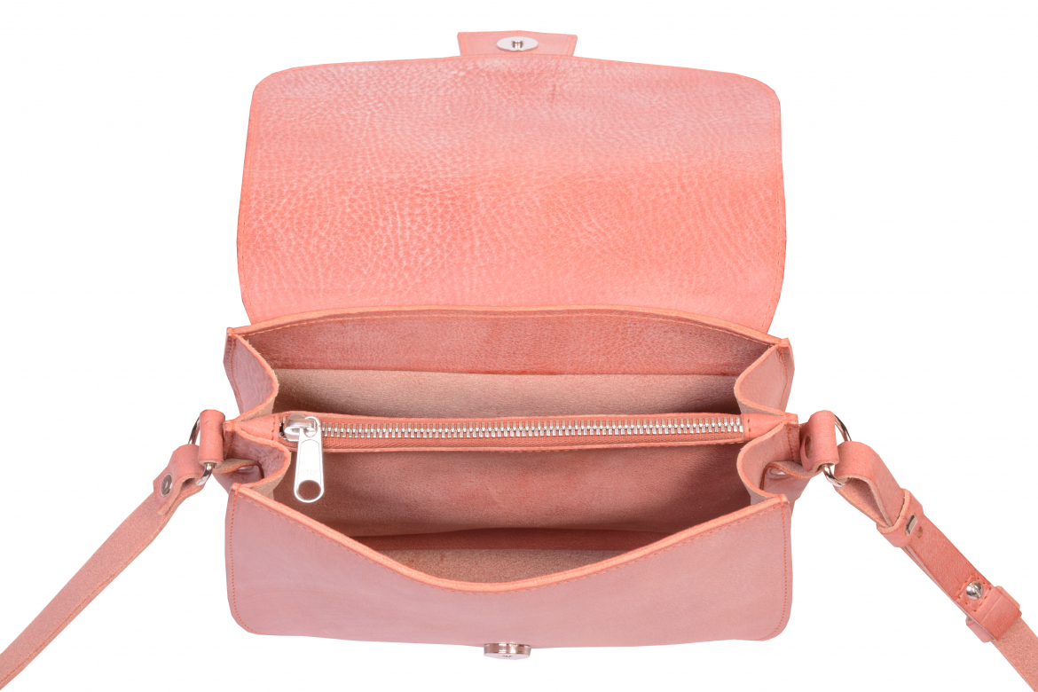 Dámská malá kabelka: NATURE (masivní - korálová), zhotovena z hovězí usně (pravá kůže), uzavíratelná klopnou na magnetický buldok. Kabelka je opatřena jedním plochým nastavitelným řemenem na rameno, který lze nosit i crossbody.