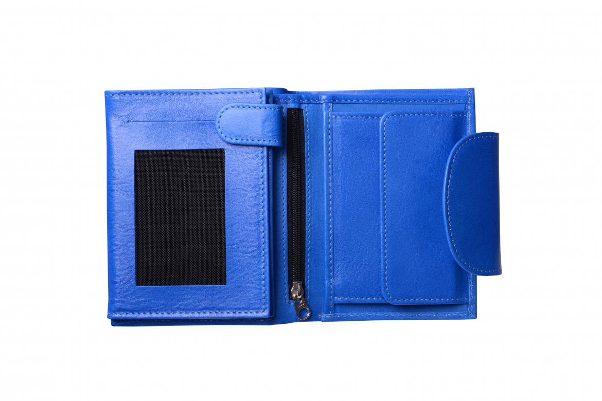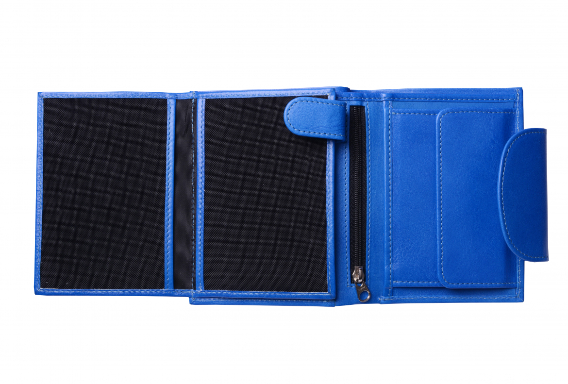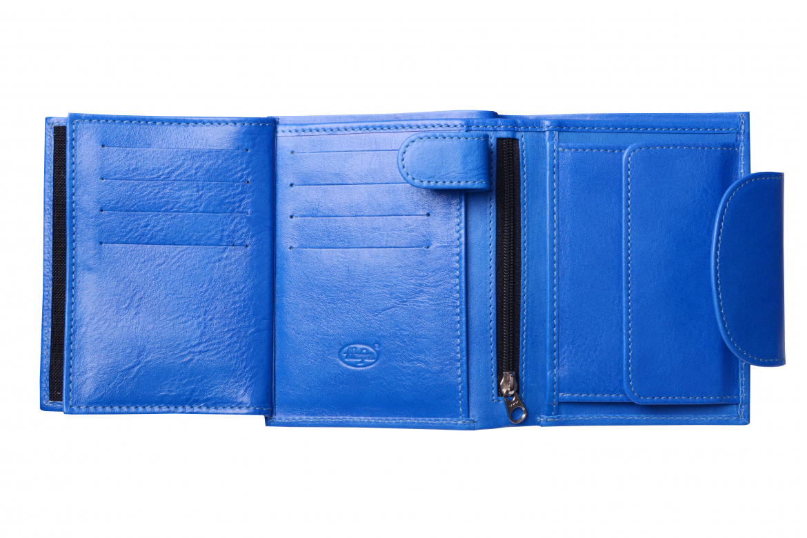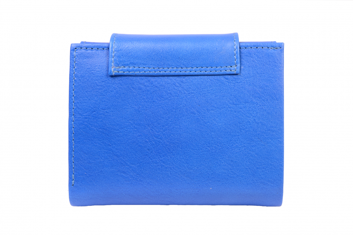 Dámská peněženka: ELEGANT - (tříslo - modrá), ušitá z hovězí usně ( prává kůže), uzavíraná širokým oválným jazykem na kovový patent.