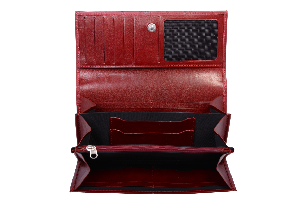 Luxusní dámská peněženka: ART - malba (vlčí máky) - červená (fuego), ušitá z hovězí usně (pravá kůže), uzavíraná klopnou na kovový patent.
