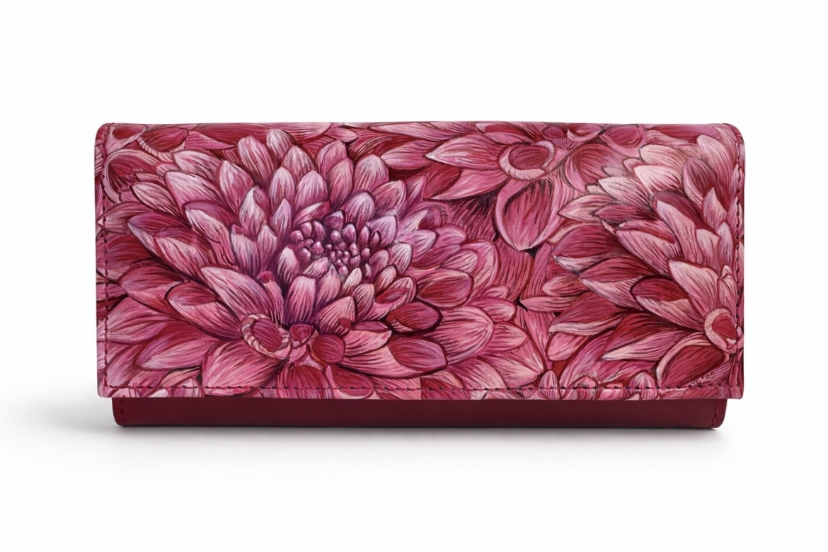 Luxusní dámská peněženka: ART - malba (jiřiny) - červená (fuego), ušitá z hovězí usně (pravá kůže), uzavíraná klopnou na kovový patent.