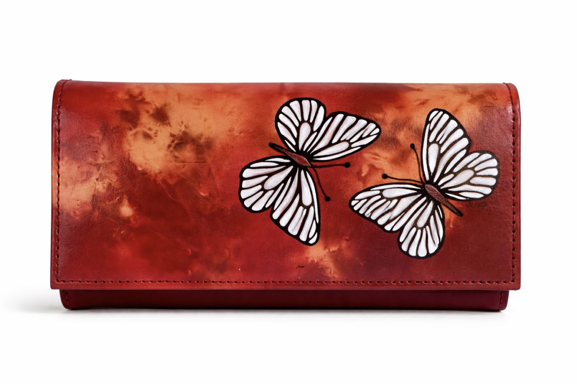 Luxusní dámská peněženka: ART - Bělásek (hlazenice - malba/tříslo - fuego), ušitá z hovězí usně (pravá kůže), uzavíraná klopnou na kovový patent.